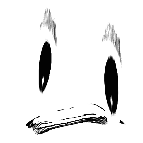The second face is a gray-scaled, frowning face with its mouth partially covered by its unusually long eyes. It has rather large pupils with some shine at the bottom.
