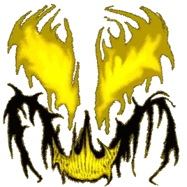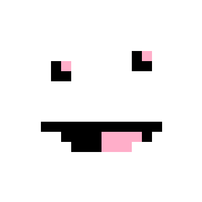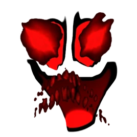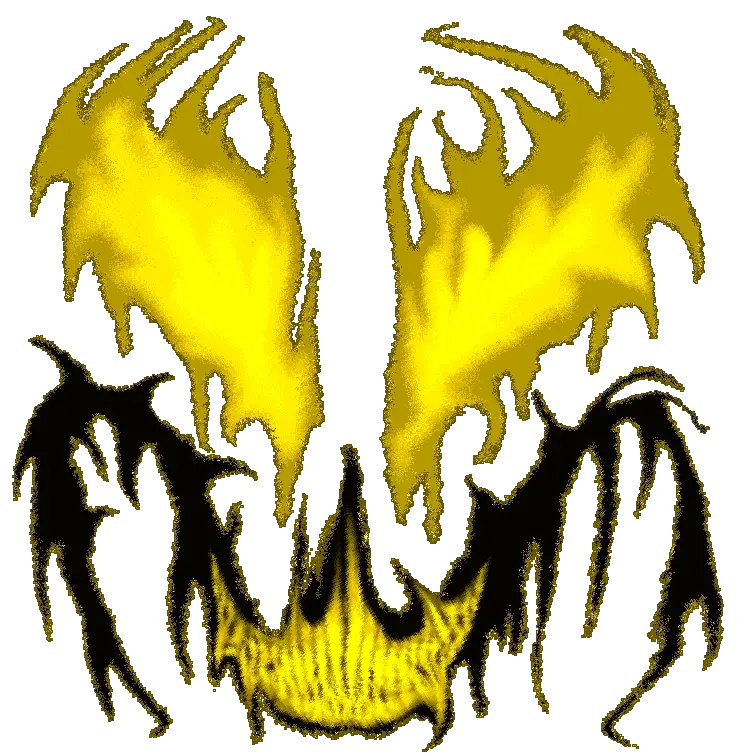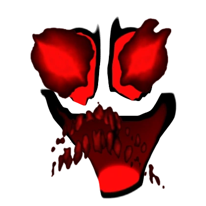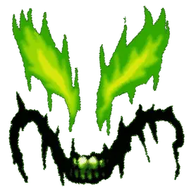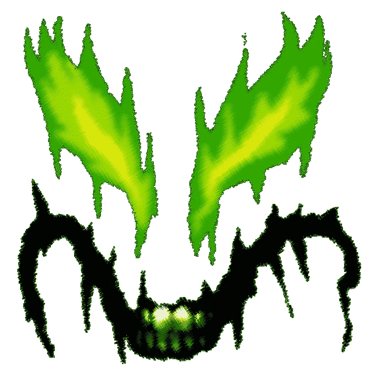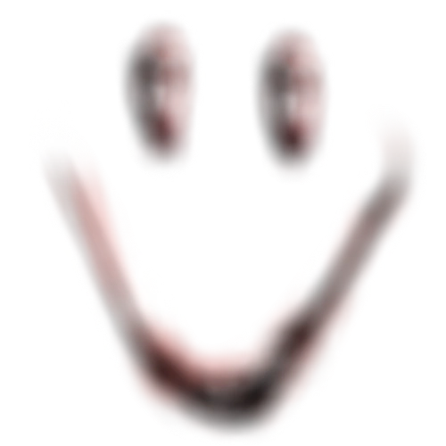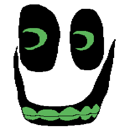 The first face is a pitch black face with both eyebrows and a large nose, something most entities lack. It has an exaggerated smile with white teeth, and a white outline completing its design.
