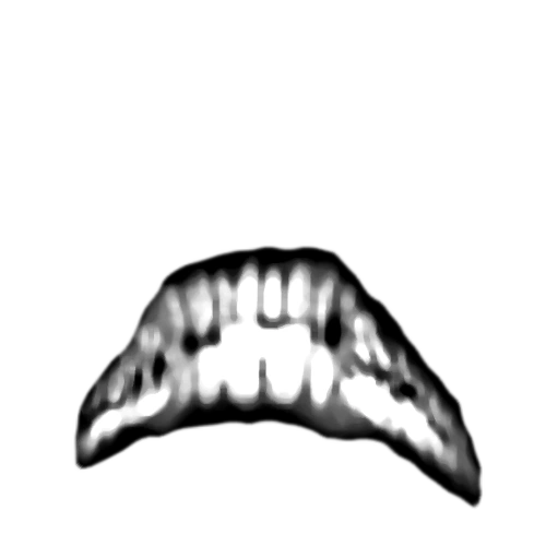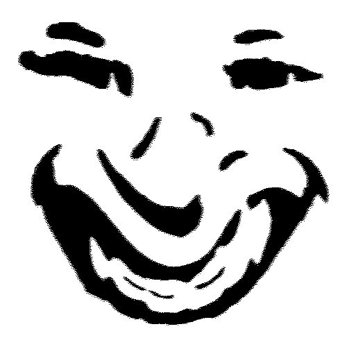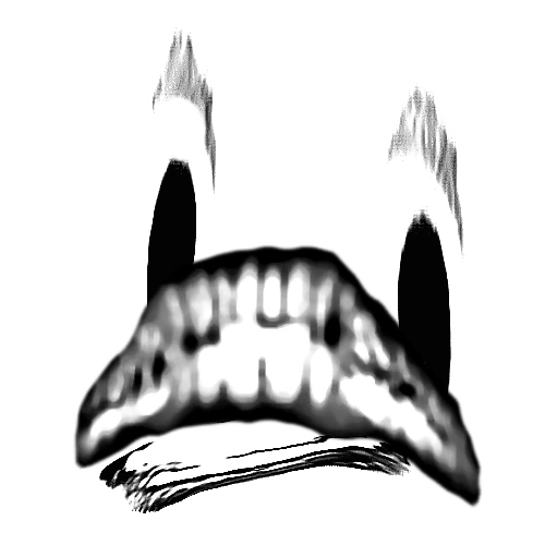 The third face is a fleshy face with a goofy, long smile face. Unlike other faces, this one is not fully black and white, instead it has some light red highlights.