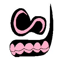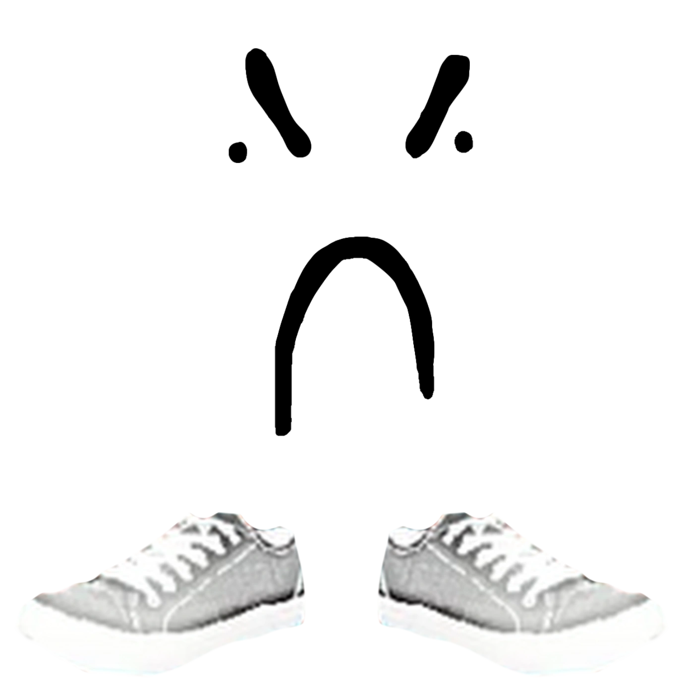 Evil Sneakers Bob appears a crudely drawn black smile with exaggerated frown and dot eyes featuring angry eyebrows