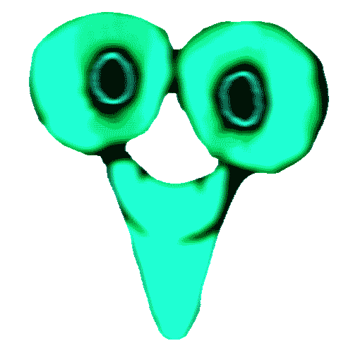 XE-1's 3rd design takes on a much more threatening appearance than E-1, with a crazed look on its distorted eyes with deranged pupils that gaze directly at the player. Its mouth is much thinner than its original counterpart, though its eyes are slightly more enlarged. It possesses a tealish-green appearance and emits a faint glow of equal hue, which is reminiscent of a Gummy Flashlight.